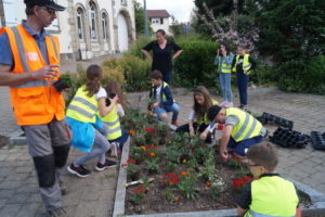 Mardi 31 mai après-midi, les élèves des classes de CE2/CM1 de Gaëlle MULLON et CM1/CM2 de Marylène RIVAT sont intervenus comme chaque année pour le fleurissement de la commune, encadrés par les agents techniques de la municipalité. C’est avec sérieux, mais pas trop et dans une ambiance festive malgré tout, que l’on a vu la motivation de tous ces jeunes à œuvrer dans cette belle expérience. En quelques heures après le dépotage, ces jeunes jardiniers ont planté près de 1000 fleurs de 25 variétés différentes. Bravo à tous ces élèves!!! Ce qui va peut-être susciter quelques vocations???