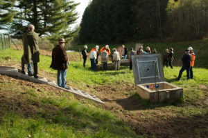 La visite s’est poursuivie à « l’usine », au lieu-dit la Molière où l’eau de la source amenée par des conduites doit subir un traitement… Celle-ci ayant un PH de 5,5 soit trop acide, un ajout de calcaire doit être effectué pour faire remonter le PH à 7,5, taux pour être propre à la consommation.